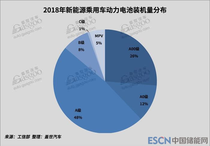 2018年全年動力電池裝機量為57.35GWh,同比增長57.0%,其中新能源乘用車裝機量達(dá)到32.86GWh,占總裝機量的57.3%,同比增長137.0%,成為動力電池的主要需求增長點。新能源乘用車2018年生產(chǎn)99.4萬輛,同比增長80.7%。動力電池裝機量增長幅度遠(yuǎn)大于產(chǎn)量增長幅度主要是因為2018年新能源乘用車轉(zhuǎn)型升級,2018年A級車生產(chǎn)44.0萬輛,電池裝機量達(dá)到15.85GWh,無論是產(chǎn)量還是動力電池裝機量都已經(jīng)遠(yuǎn)遠(yuǎn)超過A00級車(生產(chǎn)32.78萬輛,電池裝機量8.63GWh),A級車已經(jīng)牢牢占據(jù)著新能源乘用車市場最大的份額,且我們認(rèn)為A級車2019年份額還會繼續(xù)擴大。2018年插電式混動乘用車裝機量為3.71GWh,同比增長145.7%,主要是由于私人消費認(rèn)可度提升帶動,2018年比亞迪唐、榮威i6、比亞迪秦、榮威eRx5、包括合資品牌途觀L PHEV、寶馬5系等車型都在市場取得好的成績。
