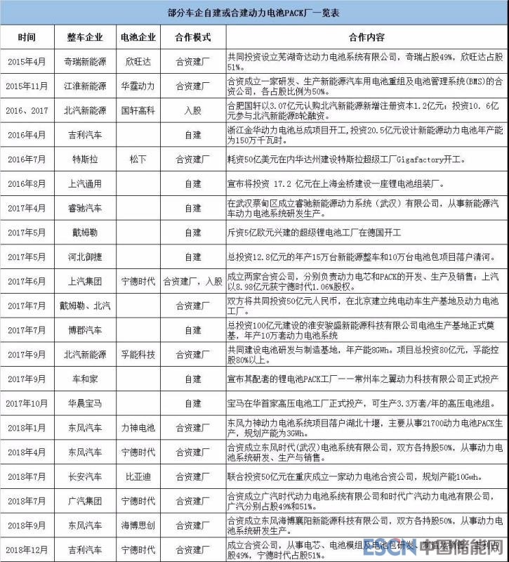 2018年以來(lái),整車(chē)企業(yè)儲(chǔ)備動(dòng)力電池、與動(dòng)力電池企業(yè)合資、自建Pack廠、自建電池研發(fā)中心等事例越來(lái)越多。在動(dòng)力電池降成本、競(jìng)爭(zhēng)激烈、標(biāo)準(zhǔn)化制造以及補(bǔ)貼退坡等的大環(huán)境下,無(wú)論從產(chǎn)業(yè)發(fā)展的角度,還是從技術(shù)發(fā)展的角度來(lái)看,主機(jī)廠自建/與電池廠戰(zhàn)略合作將成必然發(fā)展趨勢(shì)。