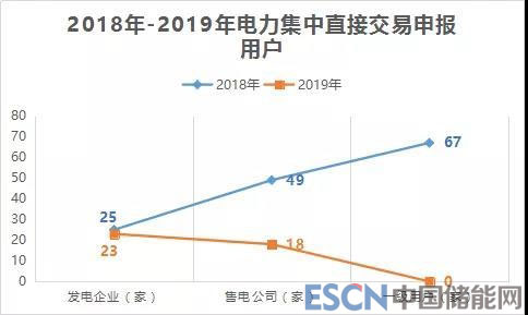 2019與2018年的電力集中直接交易中發(fā)電企業(yè)變化較小,一級用戶消失,售電公司和用戶申報數量對比如下: