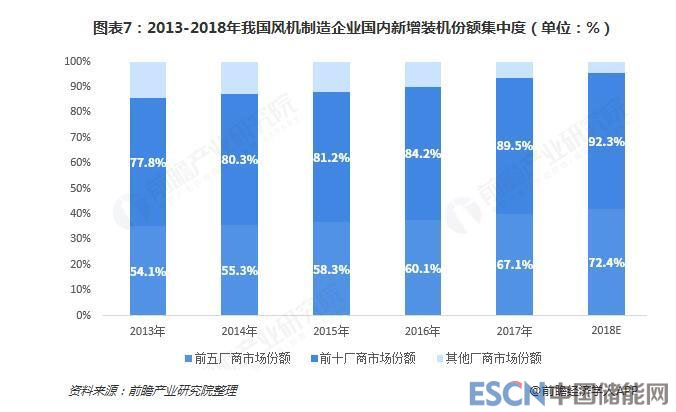 近5年,風電整機制造企業(yè)的市場份額集中趨勢越發(fā)明顯。排名前五的風電機組制造企業(yè)新增裝機市場份額由2013年的54.1%增長到2017年的67.1%,增長了13%;排名前十的風電制造企業(yè)新增裝機市場份額由2013年的77.8%增長到2017年的77.8%增長到2017年的89.5%,增長了12%。