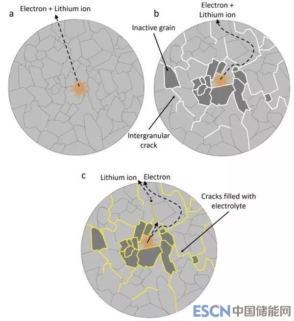 圖7 二次NCA顆粒的2D模型示意圖。(a)原始未經(jīng)充電二次NCA顆粒。(b)缺少電解液的情況下,有晶間裂紋的二次NCA顆粒。(c)存在液體電解液的情況下,有晶間裂紋的二次NCA顆粒。
