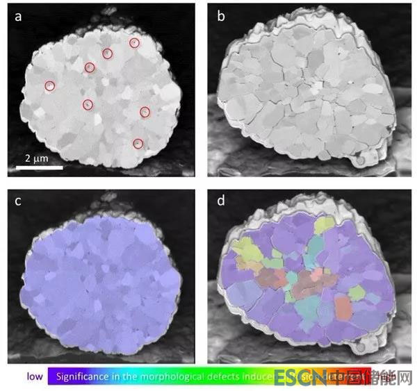 圖6(a)原始未充電NCA二次顆粒和(b)循環(huán)后NCA二次顆粒的SEM橫截面圖。(c)和(d)是按二次顆粒內(nèi)個(gè)體晶粒由裂紋引起的擴(kuò)散抑制作用的程度量化進(jìn)行彩色編碼的相應(yīng)切片。