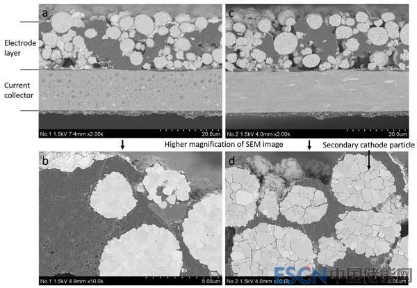 圖5(a)原始未充電NCA電極和(c)循環(huán)后(21周,滿充電)聚合物電池電極橫截面的BIB-SEM圖。其中,圖(b)是圖(a)的高倍率圖,圖(d)是圖(c)的高倍率放大圖。