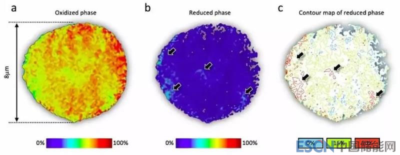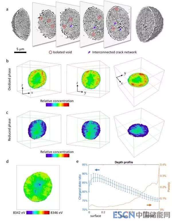 為了理解裂紋是如何影響二次顆粒內(nèi)Li離子遷移的,作者進(jìn)行了一系列的FF-TXM-XANES的實(shí)驗(yàn)研究循環(huán)后電池中Ni氧化態(tài)的2D和3D空間分布。圖3是2D-FF-TXM-XANES研究工作的總結(jié),其中氧化和還原化學(xué)物質(zhì)的空間分布是通過(guò)將空間分辨XANES數(shù)據(jù)與兩個(gè)已知原理的化學(xué)成分(也就是首周充電態(tài)和原始未充電電池中顆粒的Ni元素K邊XANES光譜)的光譜指紋進(jìn)行線性聯(lián)合擬合計(jì)算得到的。圖3(a)和圖3( b)對(duì)氧化相和還原相的相對(duì)濃度進(jìn)行了彩色編碼,其中(a)圖里與來(lái)源于充電電池的氧化指紋具有100%擬合度的部分標(biāo)記為深紅色,不相符的部分標(biāo)記為深藍(lán)色,而(b)中與原始未充電NCA光譜指紋100%擬合的標(biāo)記為紅色,不相符的部分標(biāo)記為深藍(lán)色。從圖譜結(jié)果可以看到,盡管循環(huán)后的電池是在滿充電態(tài)拆解的,在顆粒的表面和核心區(qū)域(如圖3(b)黑色箭頭所示)一些畤域仍然保持著部分放電態(tài)。圖3(c)是顆粒中還原相的等值線圖,圖中的等值線與不同的還原相濃度相對(duì)應(yīng),藍(lán)色表示還原相濃度為0%,綠色為15%,紅色為30%。通過(guò)該圖可以更加清楚地觀察到,整個(gè)顆粒中有部分仍是還原態(tài),而還原度更高的紅色區(qū)域分散排列進(jìn)一步顯示了在電化學(xué)循環(huán)過(guò)程中部分失活域是不均勻地形成的。綜上,通過(guò)2D-FF-TXM的觀察,我們可以知道NCA二次顆粒內(nèi)會(huì)因循環(huán)引起顆粒碎裂和SOC不均勻,但因受限于2D-FF-TXM無(wú)法進(jìn)行離子束方向上的解析,顆粒形態(tài)惡化和充電不完全這兩個(gè)現(xiàn)象之間的相互關(guān)系還不明確。