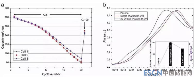 圖1(a)三個(gè)軟包電池在C/6電流密度和80℃條件下充放電1-20周,后第21周在C/100電流密度下充放電所得的循環(huán)曲線圖。(b)原始電極,首周充電態(tài)電極以及(a)中21周循環(huán)后充電態(tài)電極的Ni元素K邊X射線近邊吸收光譜(XANES)。
