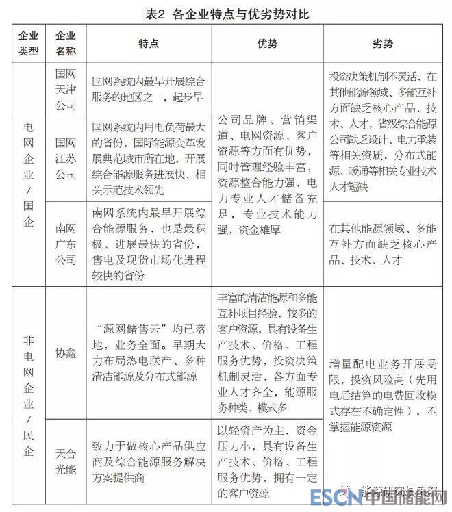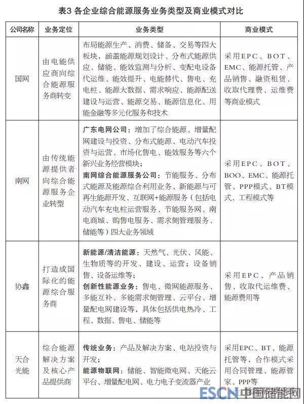 就企業(yè)對(duì)綜合能源服務(wù)業(yè)務(wù)的定位而言,國網(wǎng)、南網(wǎng)、協(xié)鑫都致力于向綜合能源服務(wù)商轉(zhuǎn)型,而天合光能致力于做提供綜合能源解決方案的服務(wù)商。就業(yè)務(wù)類型而言,由于園區(qū)、工業(yè)、大型公共建筑等對(duì)象承擔(dān)的能源價(jià)格較高、能源需求巨大、用能形式豐富,能夠取得較好的經(jīng)濟(jì)、環(huán)境、社會(huì)效益,目前,綜合能源服務(wù)企業(yè)一致將重點(diǎn)放在這三類服務(wù)對(duì)象上,統(tǒng)籌運(yùn)用能效診斷、節(jié)能改造、用能監(jiān)測(cè)、分布式新能源發(fā)電、冷熱電三聯(lián)供、儲(chǔ)能等多種技術(shù),積極推進(jìn)綜合能源服務(wù)業(yè)務(wù)。因此,其業(yè)務(wù)類型大致相近,且商業(yè)模式創(chuàng)新不足,均在積極探索中。見表3。