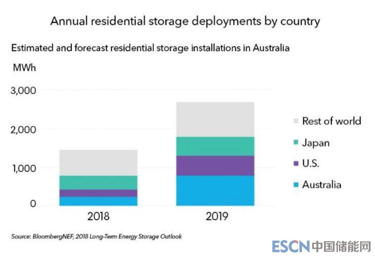在越來越多的住宅電池補(bǔ)貼計(jì)劃被納入州和地區(qū)能源政策的背景下,澳大利亞正在成為全球最大的儲(chǔ)能市場(chǎng)。根據(jù)BNEF發(fā)布的最新預(yù)測(cè),澳大利亞的戶用電池?cái)?shù)量將在2019年增加三倍。這將使澳大利亞成為世界上最熱門的戶用儲(chǔ)能市場(chǎng),占全球需求的30%。