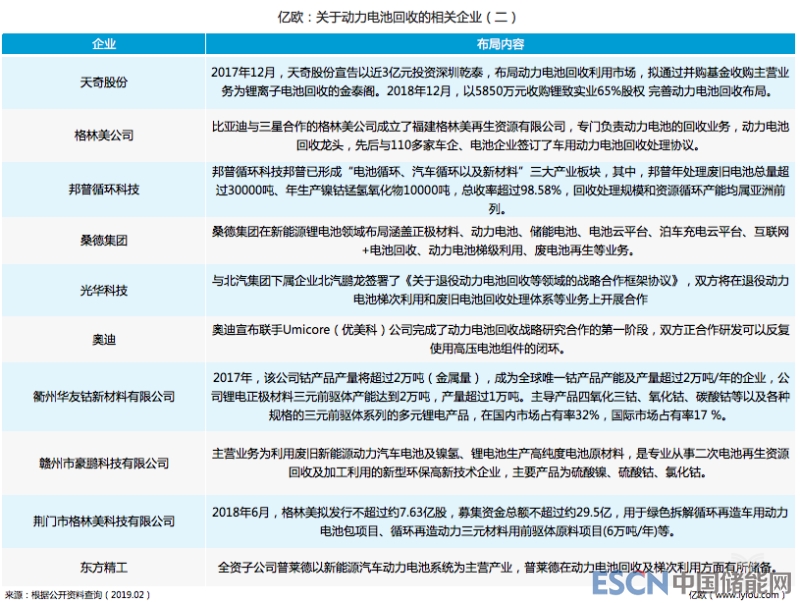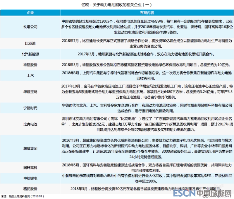 據(jù)億歐汽車統(tǒng)計(jì),在政府政策的號(hào)召下,很多企業(yè)正在逐漸步入電池回收的市場(chǎng)藍(lán)海中。