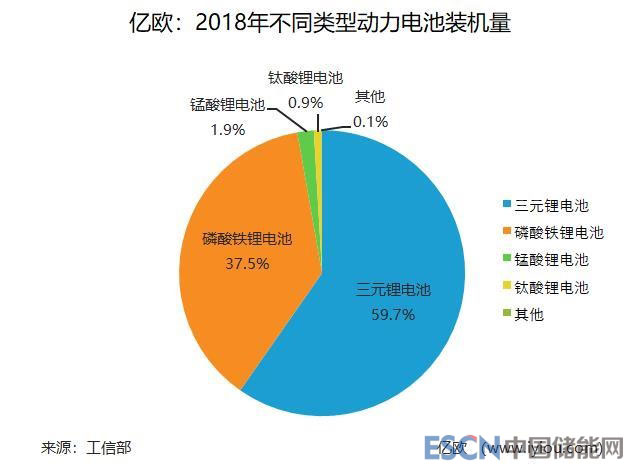據(jù)工信部統(tǒng)計,2018年全年,我國動力電池總裝機量達(dá)到57.35GWh,同比增長57.0%。其中,三元鋰電池占比達(dá)到59.7%,磷酸鐵鋰電池占比達(dá)37.5%。