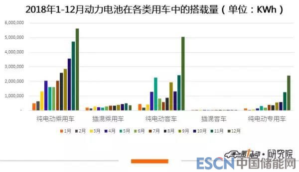 從車輛細分類別來看,2018年12月電動汽車裝機量的提升主要來源于純電動客車及純電動專用車。12月純電動客車產(chǎn)量為32652輛,環(huán)比大漲101.15%,其裝機量為5.06GWh,環(huán)比同樣大漲108.39%。純電動客車裝機量占12月總裝機量的37.4%。