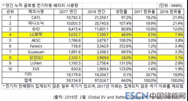 LG化學(xué)去年動力電池出貨量為7.4GWh,同比增長46.8%,市場份額在7.6%,排名第四。另一家韓國企業(yè),三星SDI的出貨量是3.0GWh,同比增長28.0%,市場份額為3.1%。