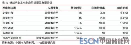 從發(fā)電側(cè)的角度看,儲能的需求終端是發(fā)電廠。由于不同的電力來源對電網(wǎng)的不同影響,以及負載端難預(yù)測導(dǎo)致的發(fā)電和用電的動態(tài)不匹配,發(fā)電側(cè)對儲能的需求場景類型較多,包括能量時移、容量機組、負荷跟蹤、系統(tǒng)調(diào)頻、備用容量、可再生能源并網(wǎng)等六類場景。