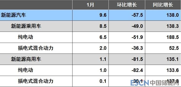 從新能源汽車產(chǎn)銷情況來看,1月份,新能源汽車產(chǎn)銷分別完成9.07萬輛和9.57萬輛,比上年同期分別增長1.1倍和1.4倍。其中純電動汽車產(chǎn)銷分別完成6.70萬輛和7.49萬輛,比上年同期分別增長1.4倍和1.8倍;插電式混合動力汽車產(chǎn)銷分別完成2.37萬輛和2.08萬輛,比上年同期分別增長59.92%和54.55%。