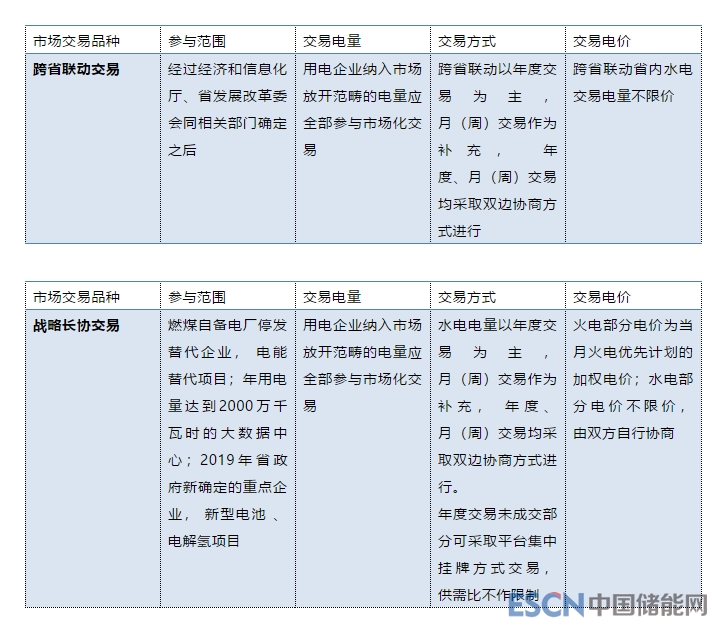 對比2018年的交易品種,可以發(fā)現(xiàn),今年增加了鋁電合作交易低谷棄水電量交易以及留存電量和關(guān)停補(bǔ)償?shù)冉灰灼贩N。其中常規(guī)直購電年度交易供需比擴(kuò)大,直購電及富余電量限價(jià)范圍擴(kuò)大,新增跨省聯(lián)動(dòng)和低谷棄水交易的內(nèi)容,同時(shí)新增用電側(cè)合同轉(zhuǎn)讓和新增發(fā)電側(cè)年度校核合同電量轉(zhuǎn)讓和拍賣交易。