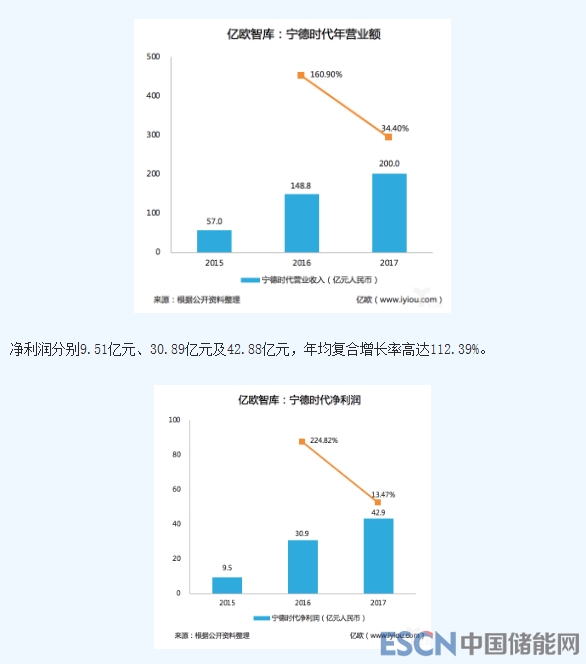 寧德時(shí)代最近三年的營(yíng)業(yè)收入、凈利潤(rùn)及資產(chǎn)規(guī)??焖僭鲩L(zhǎng)。2015年-2017年,公司營(yíng)業(yè)收入分別為57.03億元、148.79億元及199.97億元,年均復(fù)合增長(zhǎng)率高達(dá)87.26%。