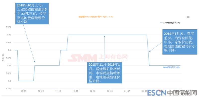 2019年1月末,臨近中國(guó)農(nóng)歷春節(jié),部分中小鋰鹽廠為了資金回籠,愿意降價(jià)出售碳酸鋰,而鋰鹽大廠堅(jiān)持高價(jià)不肯讓步。此時(shí)電池級(jí)碳酸鋰的成交價(jià)格區(qū)間拉大,為7.6-8.1萬(wàn)元/噸。并自節(jié)前維持至今。