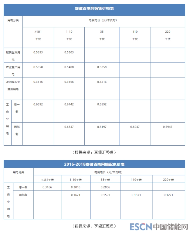 根據(jù)安徽省物價(jià)局發(fā)布的安徽省電網(wǎng)峰谷分時(shí)電價(jià)表、2016-2018年安徽電網(wǎng)輸配電價(jià)表,我們可知目前安徽的電網(wǎng)銷(xiāo)售價(jià)格和電網(wǎng)輸配價(jià)格。