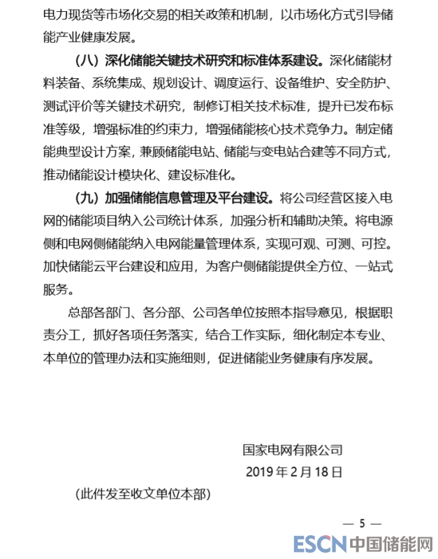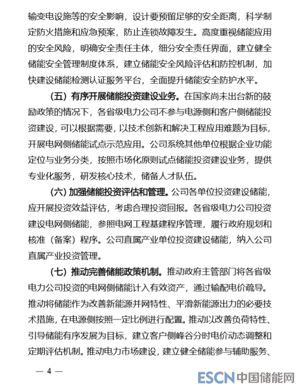 (五)有序開展儲能投資建設(shè)業(yè)務(wù)。在國家尚未出臺新的鼓勵政策的情況下,各省級電力公司不參與電源側(cè)和客戶側(cè)儲能投資建設(shè),可以根據(jù)需要,以技術(shù)創(chuàng)新和解決工程應(yīng)用難題為目標(biāo),開展電網(wǎng)側(cè)儲能試點示范應(yīng)用。公司系統(tǒng)其他單位根據(jù)企業(yè)功能定位與業(yè)務(wù)分類,按照市場化原則試點儲能投資建設(shè)業(yè)務(wù),提供專業(yè)化服務(wù),研發(fā)核心技術(shù),儲備人才隊伍。
