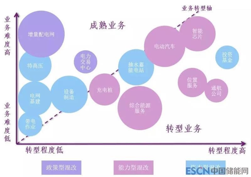 通過對國家電網(wǎng)公司混改的業(yè)務(wù)領(lǐng)域和潛在市場規(guī)模進(jìn)行了研究,梳理了十四個(gè)國家電網(wǎng)公司計(jì)劃推進(jìn)及可能推進(jìn)的混改業(yè)務(wù)方向。研究發(fā)現(xiàn)政策型混改主要集中于電網(wǎng)公司的成熟業(yè)務(wù)區(qū),能力型混改則更加集中于轉(zhuǎn)型業(yè)務(wù)區(qū),資本型混改則在兩個(gè)區(qū)域均有分布。這說明了通過混合所有制改革可以確實(shí)的助力于國家電網(wǎng)公司達(dá)成政策要求和公司戰(zhàn)略目標(biāo)。