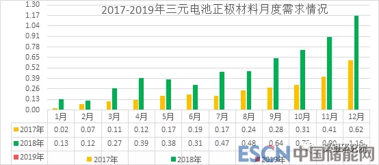 2017年1-12月NCM電池對NCM正極材料的需求量約2.71萬噸,月均需求量2262噸,僅12月月需求量超5000噸。2018年1-12月NCM電池對NCM正極材料的需求量約6.00萬噸,月均需求量4997噸,12月月需求量已超萬噸級。