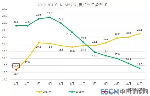 2019年1月三元正極材料依然保持年末的降價趨勢,目前NCM523主流報價下滑至15.4萬元/噸,NCM622三元材料主流報價下滑至17.1萬元/噸,NCM811三元材料主流報價已下滑至20萬元/噸。