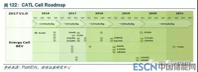 材料體系方面:CATL目前的正極材料主要為NCM 523,在2019年底有望量產(chǎn)NCM 811體系電池,正極材料除了往高鎳方向發(fā)展,CATL一直致力于高電壓平臺(tái)的正極材料研發(fā),并有望在2020年后量產(chǎn)且改善電芯的能量密度;同時(shí),在2020年左右CATL會(huì)采用硅碳負(fù)極材料以提升負(fù)極的理論能量密度從而提高電芯的能量密度;電解液通過(guò)優(yōu)化配方并添加新型添加劑,使其耐高壓性能、熱穩(wěn)定性能更好;隔膜主要采用涂覆濕法隔膜。