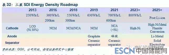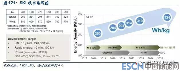 SKI:SKI在2019年正極材料體系將由NCM 622升級(jí)為摻雜NCM 811的NCM 622體系,負(fù)極材料在2021-2022年將由石墨升級(jí)為硅碳負(fù)極。產(chǎn)品規(guī)格將包括63Ah、70Ah、75Ah、80Ah、86Ah、90Ah等,使用壽命方面將保證10年24萬(wàn)公里,快充方面將10min可滿足100km的續(xù)航里程需求。2020年的能量密度目標(biāo)為284Wh/kg,2021年的能量密度目標(biāo)為294Wh/kg,2022年能量密度有望達(dá)到314Wh/kg,隨著硅碳負(fù)極的使用在2023年能量密度將達(dá)到319Wh/kg。