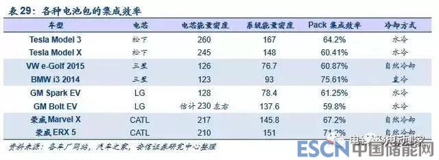 松下電池:?jiǎn)误w能量密度高,但是由于單體數(shù)量眾多,需要眾多結(jié)構(gòu)輔助件,系統(tǒng)集成難度較大,電芯至模組和電池包的集成效率較低。18650升級(jí)為21700,單體使用數(shù)量減少,一定程度上提高了集成效率。特斯拉Model 3有兩種規(guī)格模組,能量密度轉(zhuǎn)化效率高達(dá)84%。Model X(90kWh版本)的電池包由7104個(gè)電芯96S74P組成,能量密度148.4Wh/kg,集成效率為60.41%;Model 3的電池包由4416個(gè)電芯組成,能量密度167Wh/kg,集成效率為64.2%。