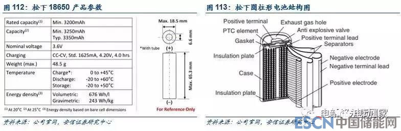 松下動(dòng)力電池:采用的是NCA正極材料,由于NCA正極材料在充放電過(guò)程中容易產(chǎn)氣的特性,電芯封裝以圓柱為主。圓柱形電池的優(yōu)點(diǎn)主要有生產(chǎn)工藝成熟,產(chǎn)品良率高,有如18650、21700等統(tǒng)一規(guī)格型號(hào),整體成本有優(yōu)勢(shì)。然而圓柱形電池缺點(diǎn)也比較明顯,NCA圓柱形電池由于安全性較差,需要配備非常好的熱管理系統(tǒng),模組以及PACK集成難度大,能量密度利用率較低。另外,除了供應(yīng)特斯拉的圓柱形電池外,松下還給其它車企供應(yīng)方形電池,主要配套HV/PHV 車型,對(duì)于HV/PHV車型,主要向高輸出功率/高容量進(jìn)行突破,對(duì)于BEV車型,則向高能量密度進(jìn)行突破。