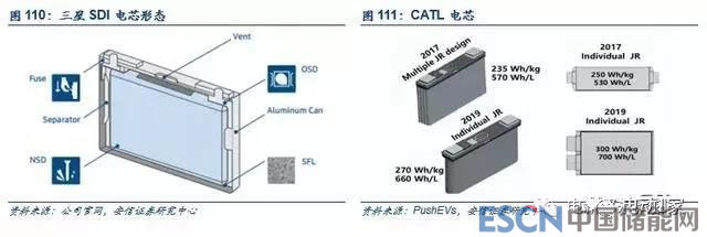 三星SDI與CATL:電芯由于采用的是方形電芯形態(tài),成組效率較高,電芯至模組最高的能量密度轉(zhuǎn)換效率可高達(dá)90%。