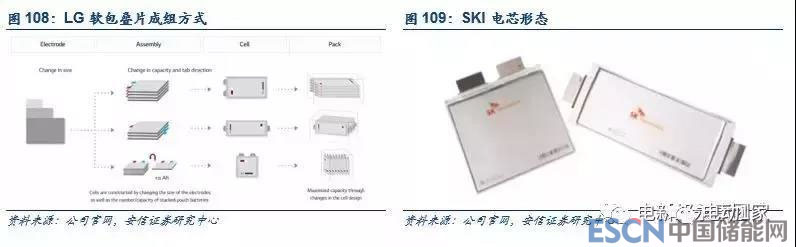 LG化學(xué)和SKI:在動(dòng)力電池在封裝方面,都采用疊片式軟包設(shè)計(jì)。軟包鋰電池與圓柱、方形電池之間的最大區(qū)別之處在于鋁塑膜,這是軟包鋰電池比較關(guān)鍵、技術(shù)難度較高的一個(gè)環(huán)節(jié)。軟包電池主要有安全性能好(軟包電池在結(jié)構(gòu)上采用鋁塑膜包裝,發(fā)生安全問(wèn)題時(shí),軟包電池一般會(huì)鼓氣裂開,不會(huì)爆炸)、重量輕(軟包電池重量較同等容量鋁殼鋰電池輕10%-20%)、內(nèi)阻小、循環(huán)性能好、設(shè)計(jì)靈活(外形可變?nèi)我庑螤?,可以更薄,可根?jù)客戶的需求定制,開發(fā)新的電芯型號(hào))等諸多優(yōu)點(diǎn)。軟包電池的缺點(diǎn)主要是一致性較差,成本較高,容易發(fā)生漏液,技術(shù)門檻高。