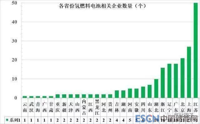 江蘇地區(qū)氫燃料電池企業(yè)最多,有51家,占全國(guó)近1/4,其次是上海、北京、廣東、遼寧和浙江等地??傮w來(lái)看,東部地區(qū)企業(yè)數(shù)量最多,發(fā)展最快。
