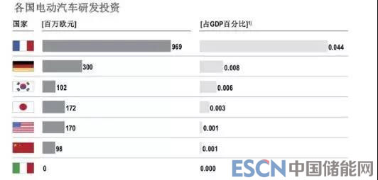 在技術(shù)層面,排名最后的兩位是中國和意大利。從研發(fā)支持角度來看差距尤為突出,中國電動汽車研發(fā)投資僅為9800萬歐元,對比研發(fā)投資金額最高的法國,簡直云泥之別。