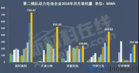 事實上,第二梯隊的競爭更為激烈。2018年累計的裝機量情況來看,國軒高科、力神、孚能科技、比克、億緯鋰能分列3-7位。從年內(nèi)月度裝機情況看,國軒高科、億緯鋰能、孚能科技、天津力神都曾在單月進入過前三的位置。