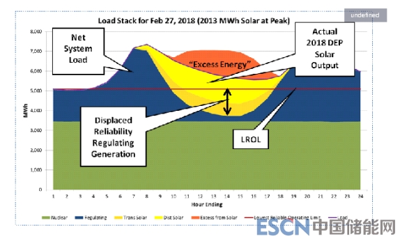 例如,主要服務(wù)于北卡羅來納州和南卡羅萊納州東部客戶的杜克能源發(fā)展公司(DEP),在2017年管理著高達106GWh的過剩能源,這些主要來自北卡羅萊納州大量的公用事業(yè)規(guī)模太陽能發(fā)電設(shè)施。當(dāng)凈需求負(fù)荷低于最低可靠運行極限(LROL)時,就會產(chǎn)生“過剩能量”。這往往發(fā)生在一天中太陽能發(fā)電量最大的時期,即上午10點到下午3點之間,如圖所示。