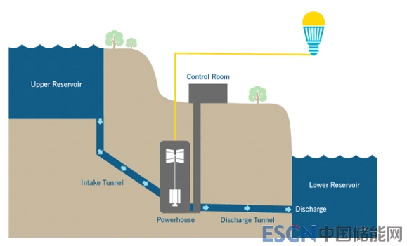 如圖所示,抽水蓄能發(fā)電的概念很簡單。利用上游水庫和下游水庫兩個水庫,采用兩用渦輪機構(gòu)成抽水蓄電設(shè)施。當(dāng)多余的電能輸送到泵房時,大型電機驅(qū)動水輪機,將下游水庫的水泵送到上游水庫,從而存儲潛在的能量供日后使用。當(dāng)需要獲取存儲的能量時,這個過程就會逆轉(zhuǎn),水流就會驅(qū)動渦輪發(fā)電機發(fā)電。