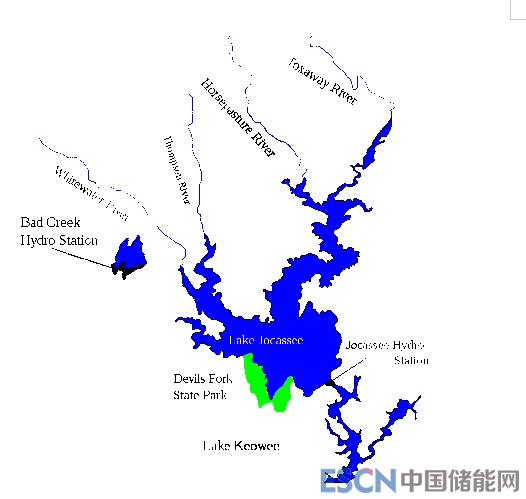 圖中顯示了杜克能源公司的兩個抽水蓄能設(shè)施的位置和布局。其中較大和較新的一個設(shè)施是1991年開通運營的Bad Creek抽水蓄能發(fā)電設(shè)施。其附近的Jocasee水電站于1975年建成,并作為一個抽水蓄能項目運行,近年來更換升級了更強大的渦輪機。這兩個地點的可用儲能量大大超過了美國公用事業(yè)規(guī)模電池儲能項目的總裝機容量,預(yù)計2018年的裝機容量約為750MW。