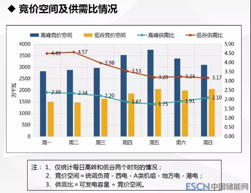 高峰時(shí)刻,競(jìng)價(jià)空間平均為3205萬(wàn)千瓦;供需比最高為2.39,最低為1.75。低谷時(shí)刻,競(jìng)價(jià)空間平均為1796萬(wàn)千瓦;供需比最高為4.57,最低為3.17。