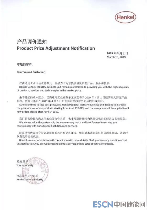 近日,膠黏劑企業(yè)“漢高通用”給用戶發(fā)出了調價函,自4月1日起的訂單將全面條件。