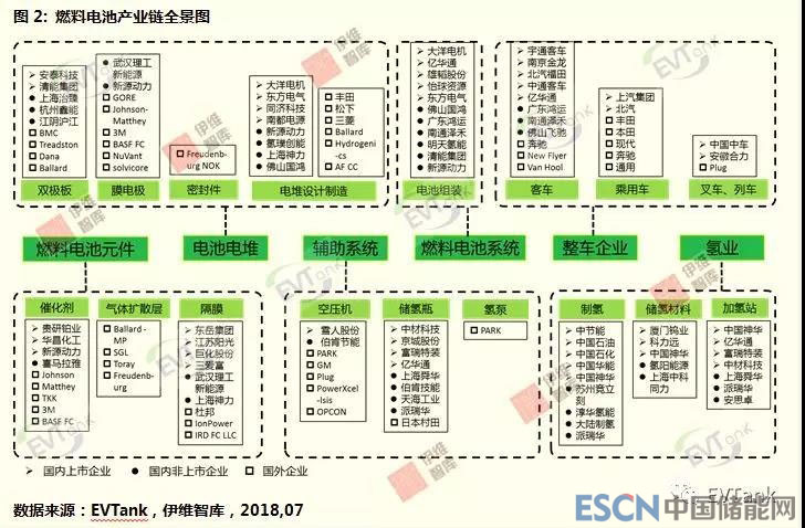 在《中國(guó)燃料電池產(chǎn)業(yè)發(fā)展白皮書(2018)》中,EVTank詳細(xì)梳理了燃料電池產(chǎn)業(yè)鏈全景圖,包括上游的燃料電池關(guān)鍵零部件,到燃料電池電堆及燃料電池系統(tǒng),最后到燃料電池的應(yīng)用領(lǐng)域及加氫站基礎(chǔ)設(shè)施建設(shè)等環(huán)節(jié)。EVTank分析認(rèn)為目前中國(guó)目前已經(jīng)基本形成了完善的燃料電池產(chǎn)業(yè)鏈,在燃料電池的關(guān)鍵環(huán)節(jié)如催化劑、雙極板、質(zhì)子交換膜等領(lǐng)域均已經(jīng)完成了小批量試制階段,即將迎來(lái)大規(guī)模量產(chǎn)。在燃料電池系統(tǒng)和應(yīng)用環(huán)節(jié),中國(guó)與國(guó)外的差距正在逐步縮小。