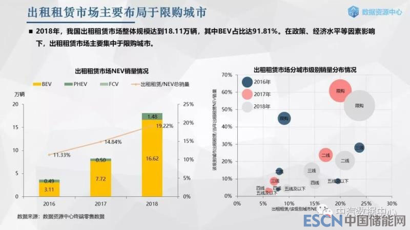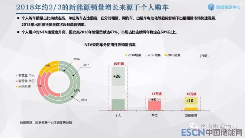 個(gè)人消費(fèi)者對(duì)新能源乘用車接受度逐漸提升,個(gè)人購車占比連續(xù)兩年穩(wěn)定在60%以上。2018年個(gè)人購車數(shù)量較上年增加26萬輛,約占全年新能源乘用車總增量的2/3。在分時(shí)租賃、網(wǎng)約車、出租車電動(dòng)化等趨勢影響下,出租租賃市場快速發(fā)展,2018年出租租賃增量接近10萬輛,年銷量首次反超單位購車,成為新的銷量增長點(diǎn)。
