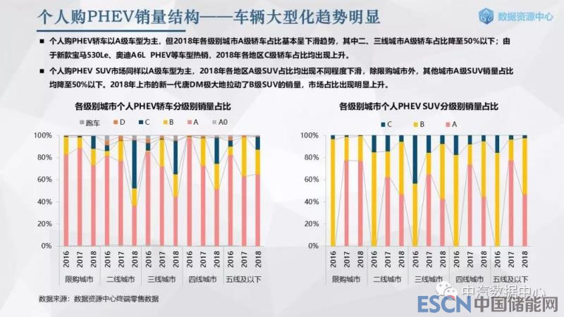 個(gè)人消費(fèi)市場PHEV銷量占比30%,高于整體市場占比,個(gè)人消費(fèi)者對(duì)于PHEV的購買意愿相對(duì)更強(qiáng)。A級(jí)轎車和A級(jí)SUV是個(gè)人PHEV市場的主力車型,隨著新款寶馬530Le、新一代唐DM、WEY P8等產(chǎn)品上市,這一系列車型或?qū)⑼苿?dòng)個(gè)人PHEV產(chǎn)品結(jié)構(gòu)向大型化轉(zhuǎn)移,并且這一現(xiàn)象在二線及以下城市更為明顯。