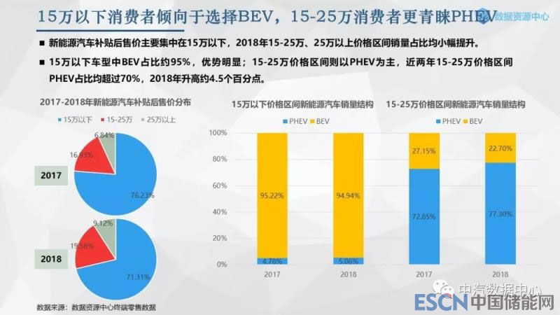 受經(jīng)濟(jì)收入水平、傳統(tǒng)車牌照價(jià)格等因素影響,一線限購城市15萬以上新能源車型銷量占比接近45%,其中15-25萬車型份額超過30%,大幅領(lǐng)先其他城市。非限購城市中15萬以下車型為銷售主力,但15萬以上車型占比較上一年有所提升。據(jù)統(tǒng)計(jì),在15-25萬元的售價(jià)區(qū)間,70%以上的消費(fèi)者更傾向于PHEV;而在15萬元以下售價(jià)區(qū)間,由于PHEV的可選擇性很小,90%以上的消費(fèi)者選擇了BEV,這也是一線限購城市能夠驅(qū)動(dòng)PHEV快速發(fā)展的主要原因。