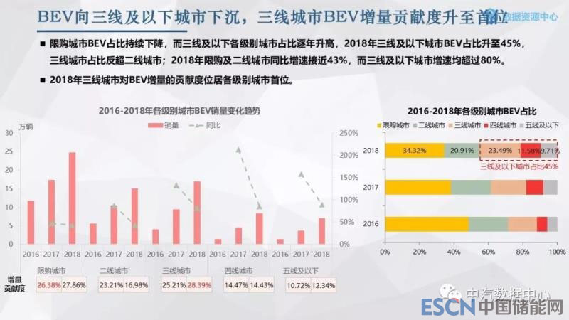 BEV在新能源技術(shù)進(jìn)步、消費(fèi)者觀念改變以及政策推動(dòng)等因素影響下開始向三線及以下級(jí)別城市下沉,該部分市場占比2018年提升至45%,而一線限購城市占比持續(xù)下降;同時(shí)三線城市占比反超二線城市,對(duì)BEV增量的貢獻(xiàn)度也位居各級(jí)別城市首位。增速方面,2018年三線及以下城市增速超過80%,遠(yuǎn)高于一二線城市的43%。