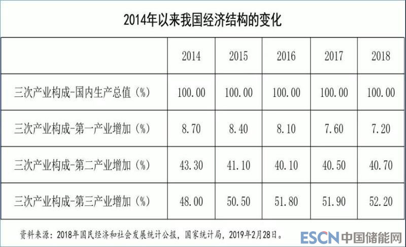 一定時期的經(jīng)濟結(jié)構(gòu)是能源效率的主要決定因素,其中高耗能的第一和第二產(chǎn)業(yè)是決定能源消費總量和效率的關(guān)鍵行業(yè)。近年來,中國的經(jīng)濟結(jié)構(gòu)在持續(xù)進(jìn)行優(yōu)化調(diào)整,具體表現(xiàn)為第三產(chǎn)業(yè)在國民經(jīng)濟中所占的比重在不斷增大,而高耗能的第一和第二產(chǎn)業(yè)比重在下降。2014年以來的五年間,第三產(chǎn)業(yè)在國民經(jīng)濟中所占的比重增加了4.2個百分點。