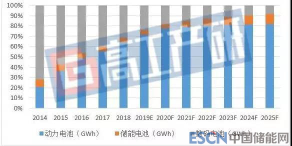 2014-2025年三大應(yīng)用終端出貨量占比情況(GWh,%)