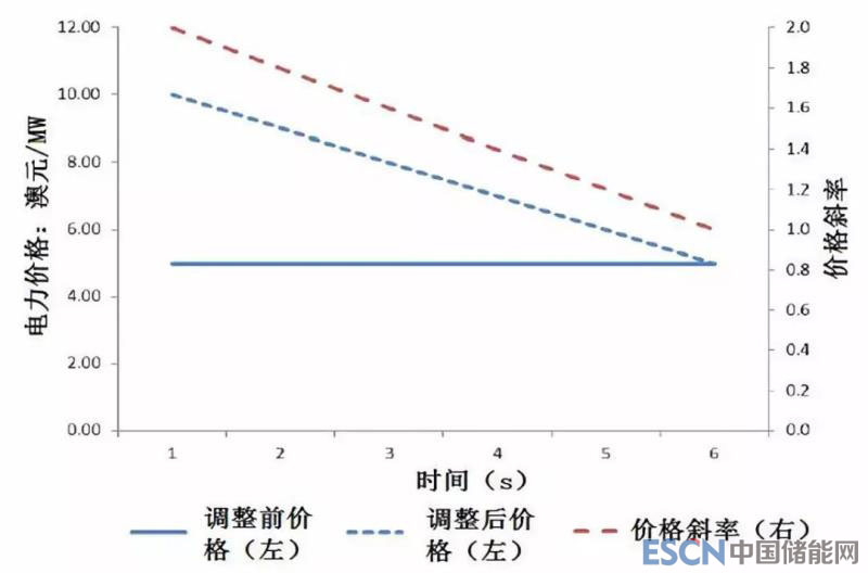 儲(chǔ)能的本質(zhì)是給能量加入時(shí)間變量,這種特質(zhì)決定了儲(chǔ)能在電網(wǎng)中的根本作用是在正確的時(shí)間提供正確的能量。我國(guó)可借鑒澳電網(wǎng)目前已經(jīng)開(kāi)展的考慮時(shí)間權(quán)重的價(jià)格斜率新型調(diào)頻輔助服務(wù)費(fèi)用核算方法,如圖13所示。以6s常規(guī)調(diào)頻輔助服務(wù)為例,圖13中藍(lán)色實(shí)線(xiàn)和虛線(xiàn)為調(diào)整前后的1-6s響應(yīng)時(shí)間對(duì)應(yīng)的輔助服務(wù)價(jià)格(對(duì)應(yīng)左側(cè)縱軸),紅色虛線(xiàn)為調(diào)整后價(jià)格/調(diào)整前價(jià)格的比率走勢(shì)(對(duì)應(yīng)右側(cè)縱軸)??梢?jiàn)若頻率下跌后1s時(shí)調(diào)頻電源出力,則調(diào)頻電源可得到10澳元/MW獎(jiǎng)勵(lì),是舊規(guī)則5澳元/MW的2倍;若頻率下跌后6s時(shí)調(diào)頻電源出力,則調(diào)頻電源僅得到5澳元/MW獎(jiǎng)勵(lì),與舊規(guī)中效益一樣。