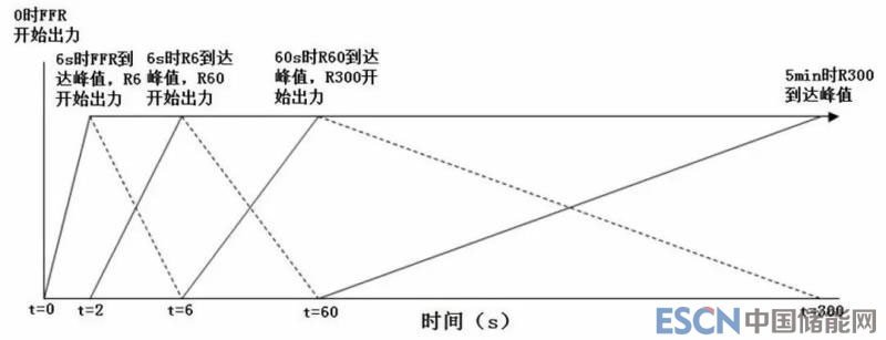 隨著電力系統(tǒng)轉(zhuǎn)動(dòng)慣量逐年減少,系統(tǒng)頻率波動(dòng)幅度愈加增大,傳統(tǒng)調(diào)頻機(jī)組的調(diào)頻響應(yīng)能力仍未提高。因此澳電網(wǎng)引入并開(kāi)展了新型快速調(diào)頻輔助服務(wù)(Fast frequency regulation 簡(jiǎn)稱(chēng) FFR)。并將新型 2s FFR 與傳統(tǒng)的 6s、60s、300s常規(guī)調(diào)頻輔助服務(wù)聯(lián)合使用,保持系統(tǒng)頻率下降 300 秒內(nèi)調(diào)頻機(jī)組有功出力總和不變,如圖12所示。未來(lái)澳電網(wǎng)將制定 0.5s 甚至 ms 級(jí) FFR 輔助服務(wù)標(biāo)準(zhǔn)。