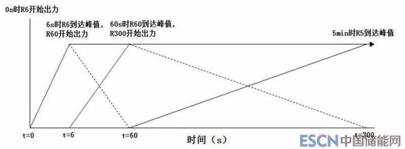 除6秒調(diào)頻輔助服務(wù)(R6機(jī)組提供),澳電網(wǎng)還有60秒(R60機(jī)組提供)和300秒(R300機(jī)組提供)常規(guī)調(diào)頻輔助服務(wù),保持300秒?yún)^(qū)間內(nèi)調(diào)頻有功出力總和不變,如圖11所示。0秒時(shí)R6啟動(dòng),6秒到達(dá)峰值并下降;6秒時(shí)R60啟動(dòng),60秒到達(dá)峰值并下降;60秒時(shí)R300啟動(dòng),5分鐘到達(dá)峰值。