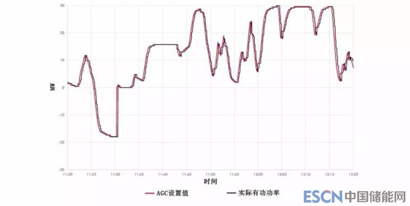 我國(guó)電網(wǎng)一次調(diào)頻的主力是大型火電機(jī)組,缺乏響應(yīng)速度和調(diào)節(jié)能力俱佳的優(yōu)質(zhì)調(diào)頻電源。而根據(jù)澳大利亞的實(shí)際運(yùn)行經(jīng)驗(yàn),儲(chǔ)能對(duì)比傳統(tǒng)火電機(jī)組的AGC跟蹤效果更好。圖7、8分別為2018年1月某日南澳大利亞州傳統(tǒng)大型火電機(jī)組和Tesla儲(chǔ)能的AGC跟蹤能力對(duì)比。圖中紅色為電網(wǎng)設(shè)定的AGC曲線(xiàn),黑色為機(jī)組或儲(chǔ)能實(shí)際有功功率曲線(xiàn)。明顯可見(jiàn)Tesla儲(chǔ)能的響應(yīng)能力對(duì)比燃?xì)鈾C(jī)組響應(yīng)能力的擬合度更高,其有功功率輸出更精確且反應(yīng)速度更快。